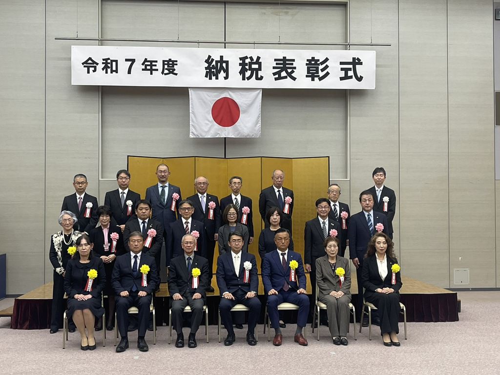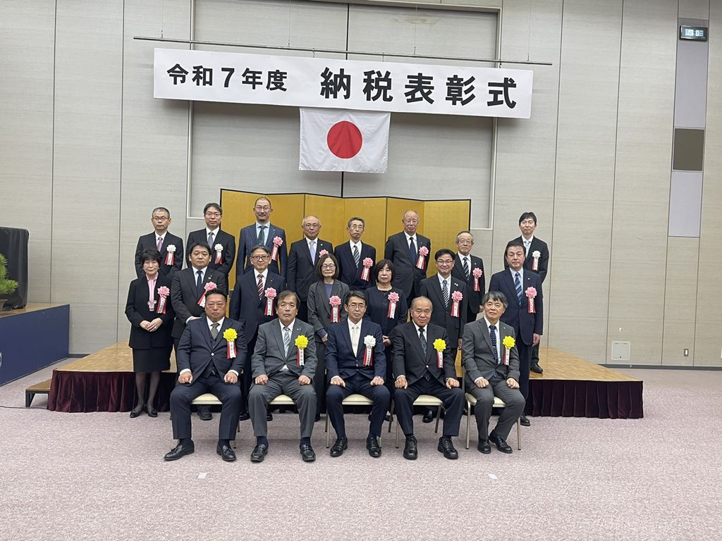 令和7年11月13日(木)、JFEみやざき倶楽部において本年度の千葉南税務署納税表彰式が挙行され、当会より9名の方々が受彰されました。受彰された方々は納税道義の高揚と税務知識の普及に貢献されるなど、永年にわたり税務行政に積極的に協力してこられた功績が高く評価され栄えある表彰を受けられました。